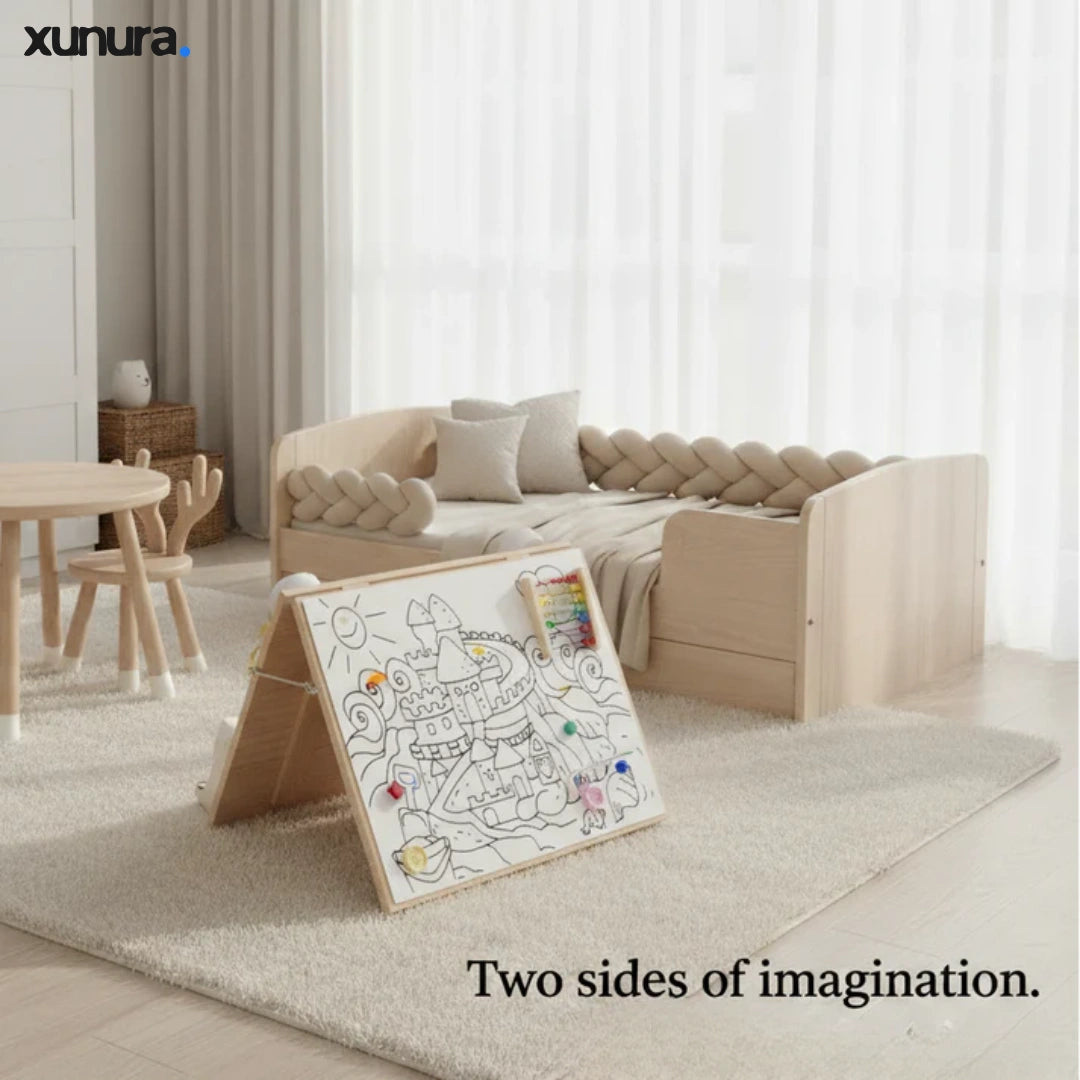 Crafted from premium solid wood with smooth, child-safe finishes, this double-sided board combines real mechanisms like locks, zippers, and switches with a creative drawing surface — ideal for teaching everyday skills through play.