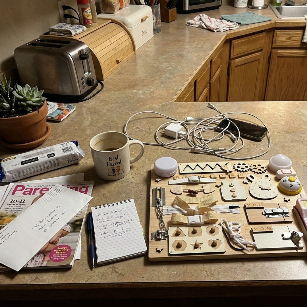 A hands-on wooden activity board that turns learning into play — perfect for toddlers to explore real textures, mechanisms, and cause-and-effect discovery.